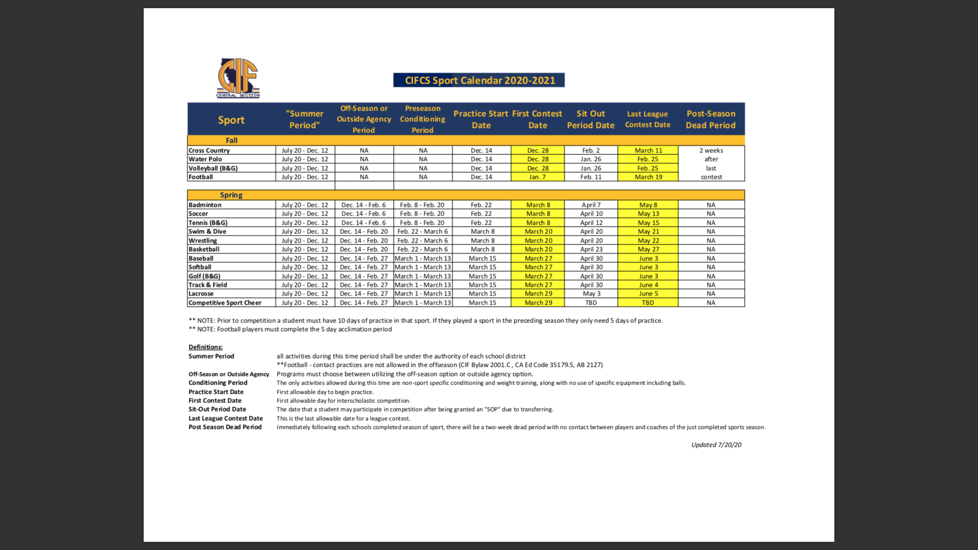 - Cif announced that it will push its 2020 2021 athletic calendar starting dates back to december on monday july 20.